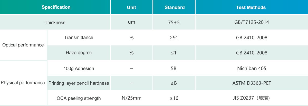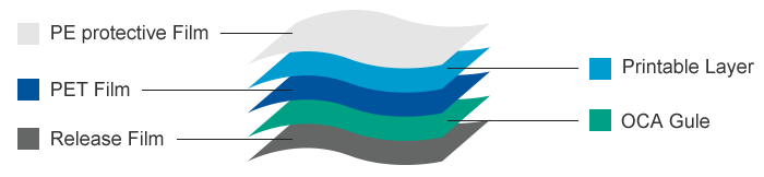 Based on optical grade PET, GDF decorative film enjoys good printability on one side and it is coated with OCA glue on the other side. It has excellent die-cutting process ability, printability, and adhesion to glass cover.